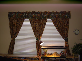 Here’s a picture of the curtains that I made for our “classroom”. My daughter wanted a safari type them, so I went all out. The curtains are very simple to make. There are just 4 panel curtains — just do a simple hem on the bottom and sides (if necessary, I just left the salvaged edge) then make a simple pocket for the rod. Then I made 4? valances (it’s been awhile). Once again, just hem the bottom and make simple pocket for the rod. It took less than 30 minutes to make these.
