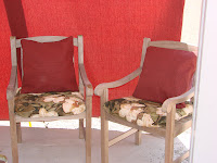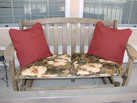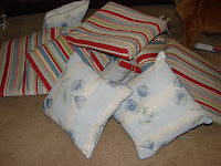 I decided that I didn’t want to spend a lot of time on these, so I just made easy slipcovers for the cushions and pillows. Here is how they turned out.